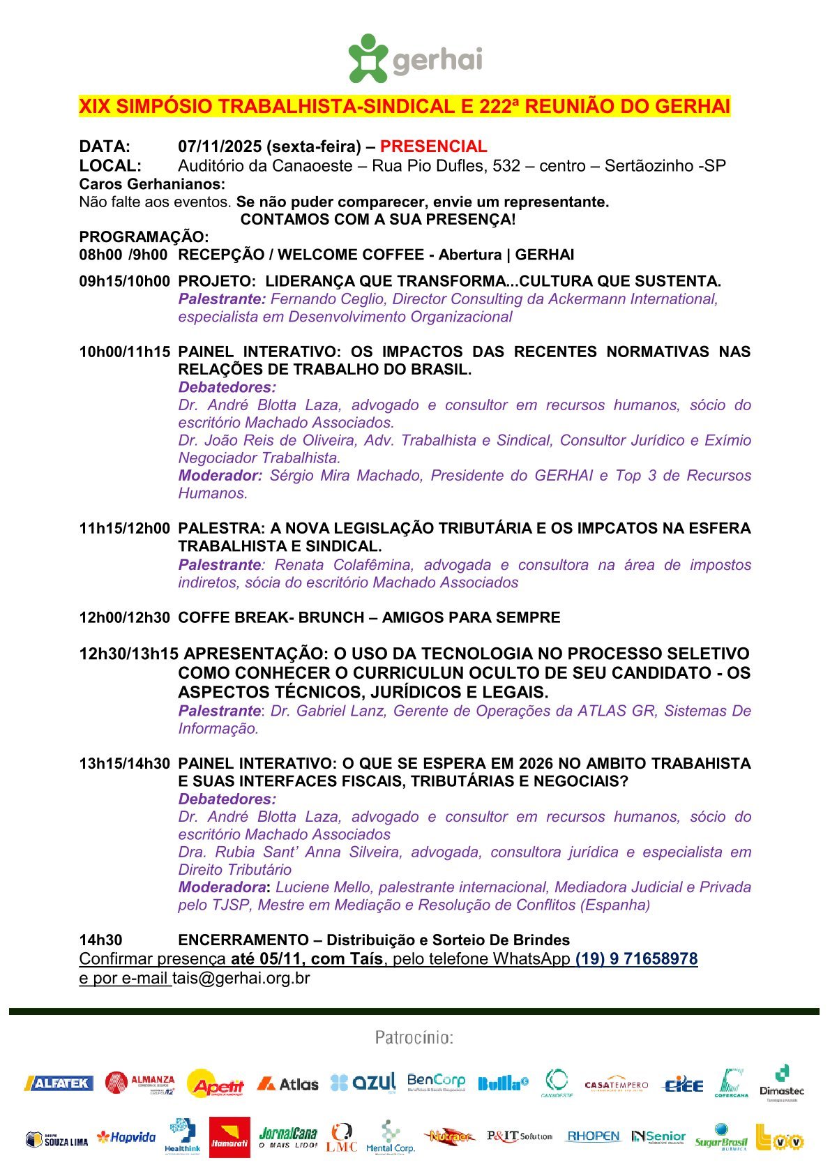 - Confirmar presença até 05/11, com Taís, pelo telefone WhatsApp (19) 9 71658978 e por e-mail [email protected]