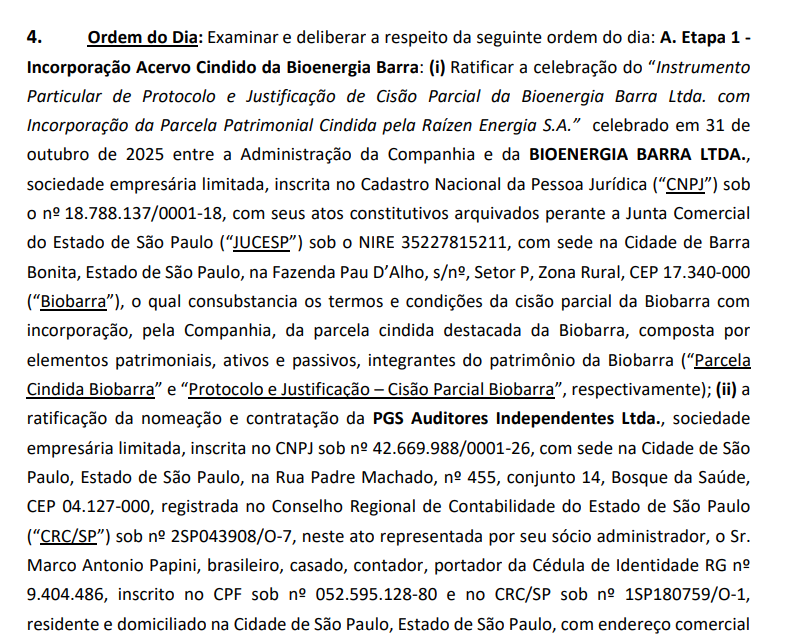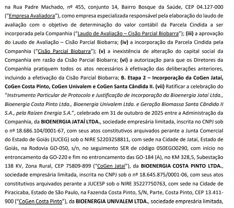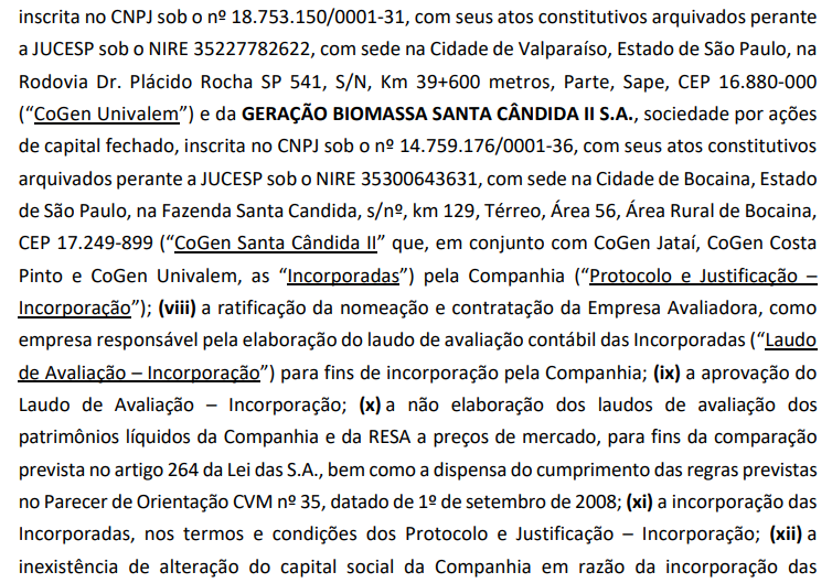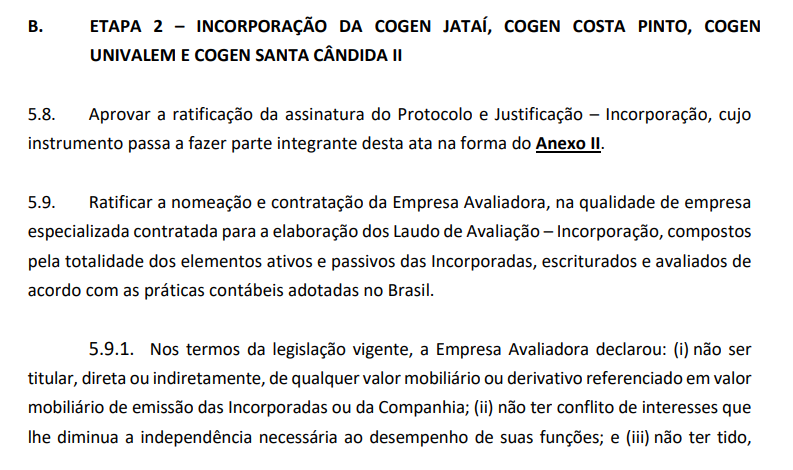 Em seguida, a companhia incorporará quatro empresas de geração de energia a partir da biomassa: CoGen Jataí, CoGen Costa Pinto, CoGen Univalem e CoGen Santa Cândida II, que, juntas, somam mais de R$ 1,1 bilhão em patrimônios líquidos avaliados.
