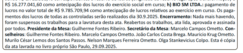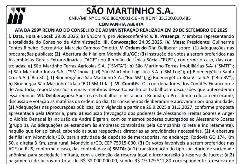 Por meio de ata, a bioenergética São Martinho S.A. (CNPJ 51.466.860/0001-56) divulga como foi a reunião do Conselho de Administração realizada em 29 de setembro de 2025.