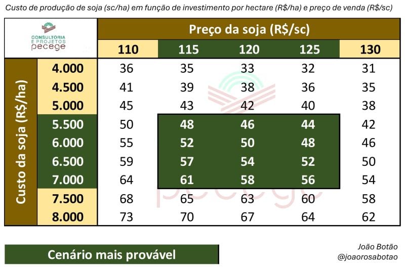 “Com o atual patamar de preços da oleaginosa longe das máximas históricas que vimos alguns anos atrás e, custos pressionados pelos insumos de produção, a produtividade de equilíbrio esta relativamente alta. É isso que ilustra o quadro que segue a publicação.