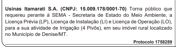 Por meio de publicação no Diário Oficial do Mato Grosso, a Usinas Itamarati S.A. (CNPJ 15.009.178/0001-70) oficializa pedido para atividade de irrigação.