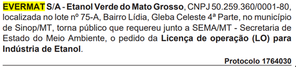 O pedido foi feito junto à SEMA – Secretaria de Estado do Meio Ambiente de Mato Grosso, e garante o funcionamento da indústria de acordo com as medidas de controle ambiental e condicionantes estabelecidas nas fases anteriores do licenciamento.
