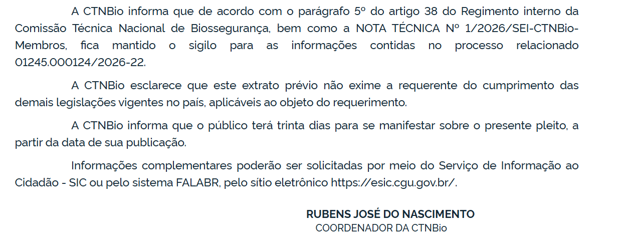 A CTNBio informa que de acordo com o parágrafo 5º do artigo 38 do Regimento interno da Comissão Técnica Nacional de Biossegurança, bem como a NOTA TÉCNICA Nº 1/2026/SEI-CTNBio-Membros, fica mantido o sigilo para as informações contidas no processo relacionado 01245.000124/2026-22.