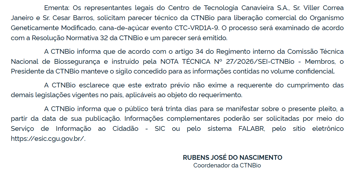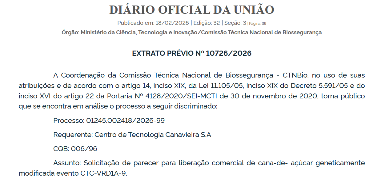 Por meio de Extrato Prévio, a Comissão Técnica Nacional de Biossegurança (CTNBio) divulga manifestação sobre cana-de- açúcar geneticamente modificada do Centro de Tecnologia Canavieira (CTC).