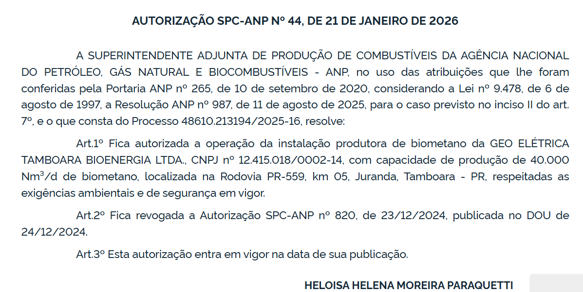 Por meio da Autorização 44, de 21 de janeiro de 2026, a Superintendência de Produção de Combustíveis da ANP oficializa operação da instalação de usina de biometano de cana.