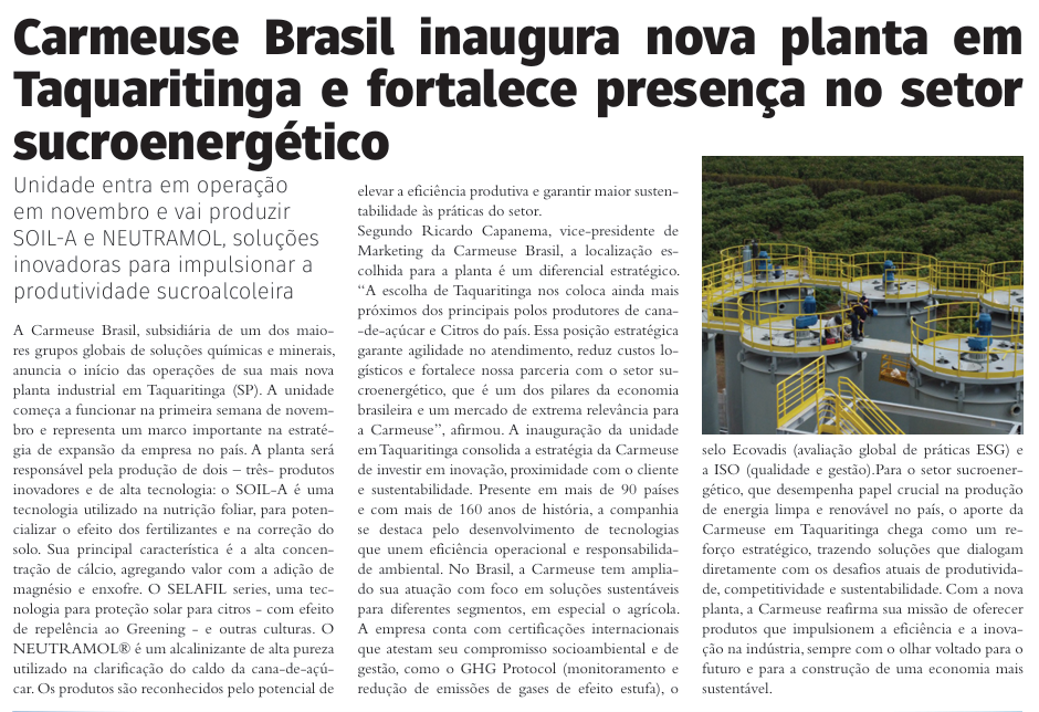 Unidade da Carmeuse Brasil em Taquaritinga (SP) entra em operação em novembro e vai produzir SOIL-A e NEUTRAMOL