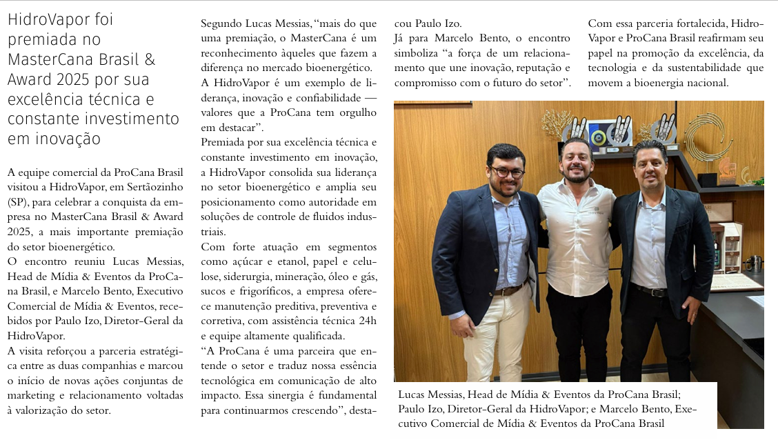 Lucas Messias, Head de Mídia & Eventos da ProCana Brasil; Paulo Izo, Diretor-Geral da HidroVapor; e Marcelo Bento, Executivo Comercial de Mídia & Eventos da ProCana Brasil