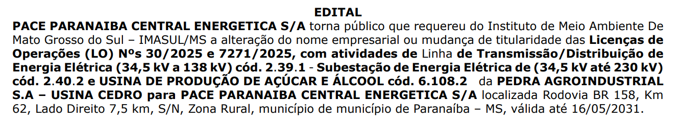- Torna público que requereu do Instituto de Meio Ambiente De Mato Grosso do Sul (Imasul/MS) a alteração do nome empresarial ou mudança de titularidade das Licenças de Operações (LO) Nºs 30/2025 e 7271/2025