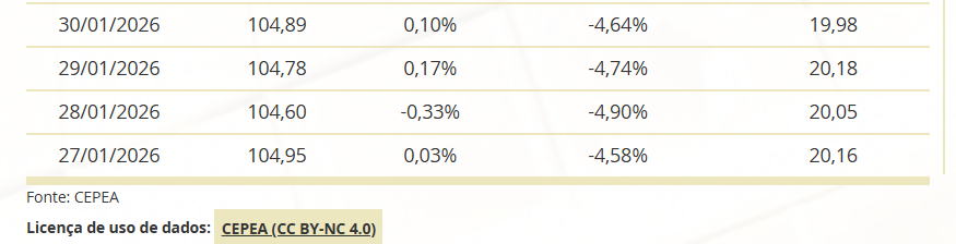 Levantamento do Cepea mostra que a média mensal do Indicador CEPEA/ESALQ, cor Icumsa de 130 a 180, foi de R$ 105,87/saca de 50 kg em janeiro, 3,44% abaixo da de dezembro/25 (de R$ 109,69/sc).