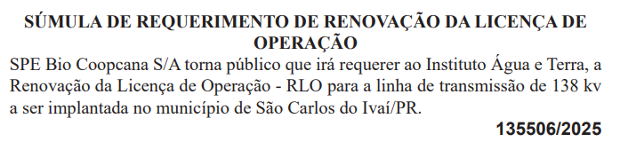 Por meio de publicação no Diário Oficial do Paraná, usina de cooperativa informa que irá requerer a renovação de licença de operação (RLO) para linha de transmissão de 138 kilowatts (kv).