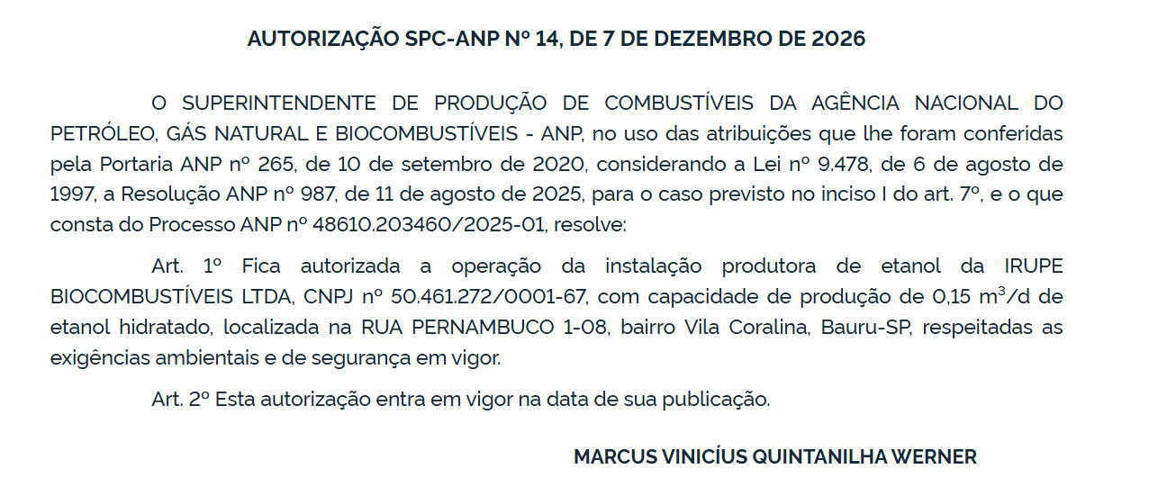 - Art. 1º Fica autorizada a operação da instalação produtora de etanol da IRUPE BIOCOMBUSTÍVEIS LTDA, CNPJ nº 50.461.272/0001-67, com capacidade de produção de 0,15 m³/d de etanol hidratado, localizada na RUA PERNAMBUCO 1-08, bairro Vila Coralina, Bauru-SP, respeitadas as exigências ambientais e de segurança em vigor.
