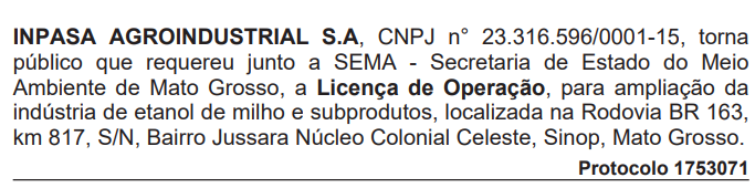 Que torna público que requereu junto a SEMA – Secretaria de Estado do Meio Ambiente de Mato Grosso, a Licença de Operação, para ampliação da indústria de etanol de milho e subprodutos.
