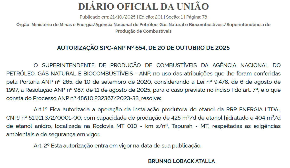 Por meio da autorização 654, de 20 de outubro de 2025, nova usina de etanol de milho tem aval para produzir 429 mil litros por dia.