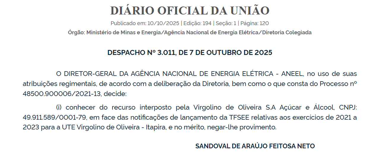 Por meio do Despacho 3.011, de 07 de outubro de 2025, a Diretoria Colegiada da Agência Nacional de Energia Elétrica (Aneel) se manifesta sobre recurso interposto pela Virgolino de Oliveria S. A. Açúcar e Álcool (CNPJ 49.911.589/0001-79).