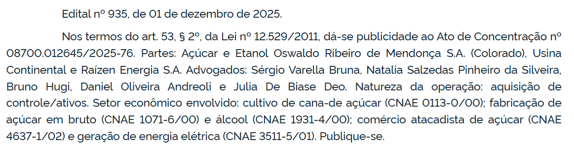 Por meio do Edital nº 935, de 01 de dezembro de 2025, a Superintendência-Geral do Conselho Administrativo de Defesa Econômica (Cade) “dá publicidade a ato de concentração” que integra aquisição de usina.
