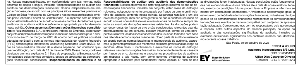 Por meio de publicação, a Raízen Power Comercializadora de Energia Ltda. divulga as demonstrações financeiras dos exercícios encerrados em 31 de março de 2025.