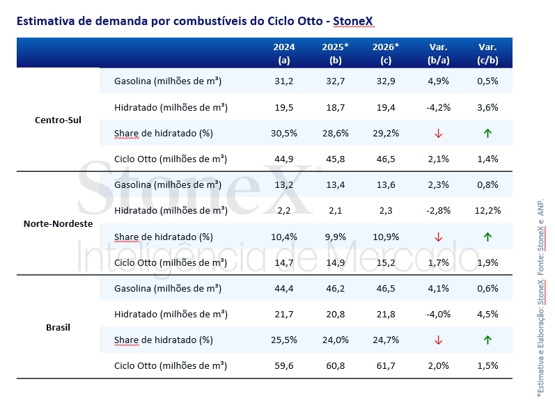A StoneX projeta crescimento moderado da demanda por combustíveis do Ciclo Otto em 2026, estimado em 1,5%, totalizando 61,7 milhões de m³ — novo recorde histórico, porém com expansão mais contida devido ao ritmo mais lento da atividade econômica.