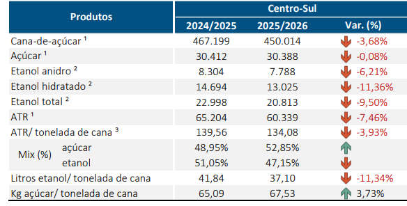 No acumulado da safra 2025/2026 até 16 de setembro, a moagem atingiu 450,01 milhões de toneladas, ante 467,20 milhões de toneladas registradas no mesmo período no ciclo anterior – retração de 3,68%.