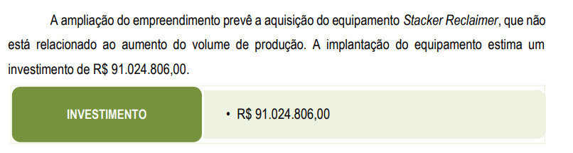 O aporte é para a aquisição do Stacker Reclaimer, “equipamento de grande porte utilizado em sistemas de armazenagem e recuperação de materiais sólidos a granel em pátios industriais”, como destaca a empresa no documento.