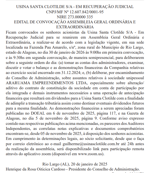 - Ficam convocados os senhores acionistas da Usina Santa Clotilde S/A – Em Recuperação Judicial para se reunirem em Assembleia Geral Ordinária e Extraordinária