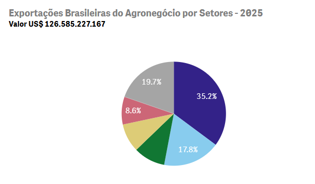 Já em terceiro vem o setor de carnes, com 17,8% e, em valores, US$ 22,5 bilhões.
