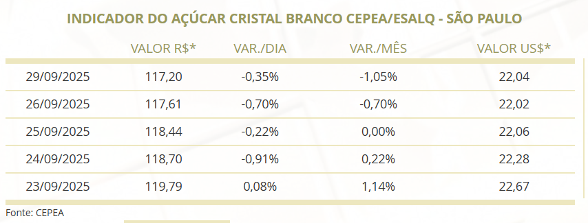 Cálculos do Centro de Estudos da Esalq/USP mostram que, de 22 a 26 de setembro, enquanto a média semanal do Indicador de Açúcar Cristal CEPEA/ESALQ foi de R$ 118,85/sc, a das cotações do contrato nº 11 da ICE Futures (vencimento Outubro/25) foi de R$ 108,86/sc.