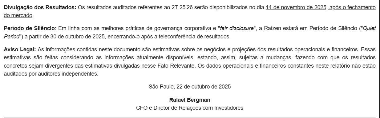 Por meio de Fato Relevante, a Raízen divulga nova projeção para a safra 2025/26.